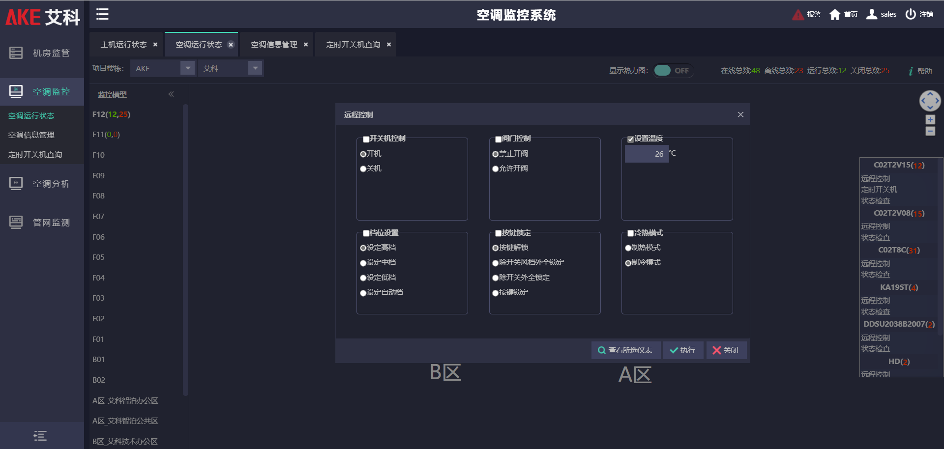 艾科智慧建筑能源管理平臺(tái),掌握設(shè)備實(shí)時(shí)連接狀態(tài)與通訊情況,監(jiān)測(cè)系統(tǒng)末端設(shè)備運(yùn)行情況,可視化設(shè)備分布情況,實(shí)現(xiàn)末端設(shè)備遠(yuǎn)程統(tǒng)一管理。